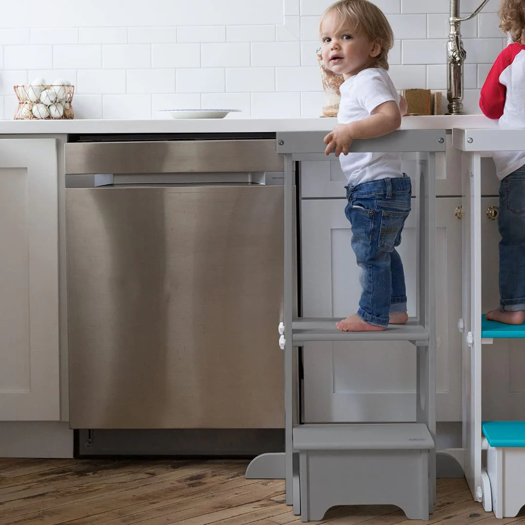 The Explore N Store Learning Tower⢠has been designed with the guiding principles of hands-on learning in mind, bringing children to counter height to encourage exploration, independence and interaction with parents and older siblings. Its compact profile makes it a perfect fit under kitchen counters and islands, while its adjustable design grows to meet your childās needs.